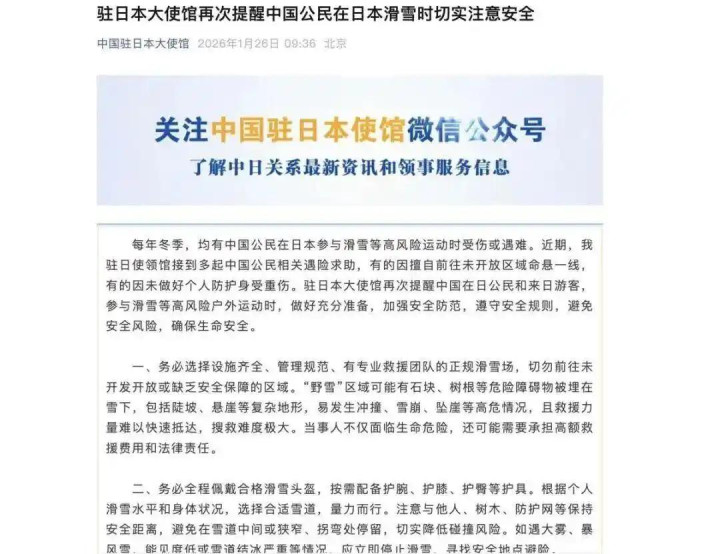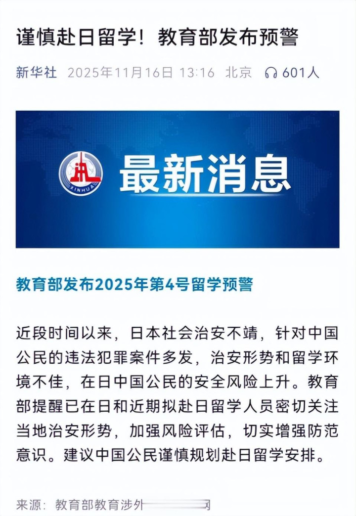 2025年11月14日,外交部和中国驻日本使领馆就联合发布了风险提醒,明确警示当地社会治安动荡、地震等天灾频发,建议公民尽量避免前往。