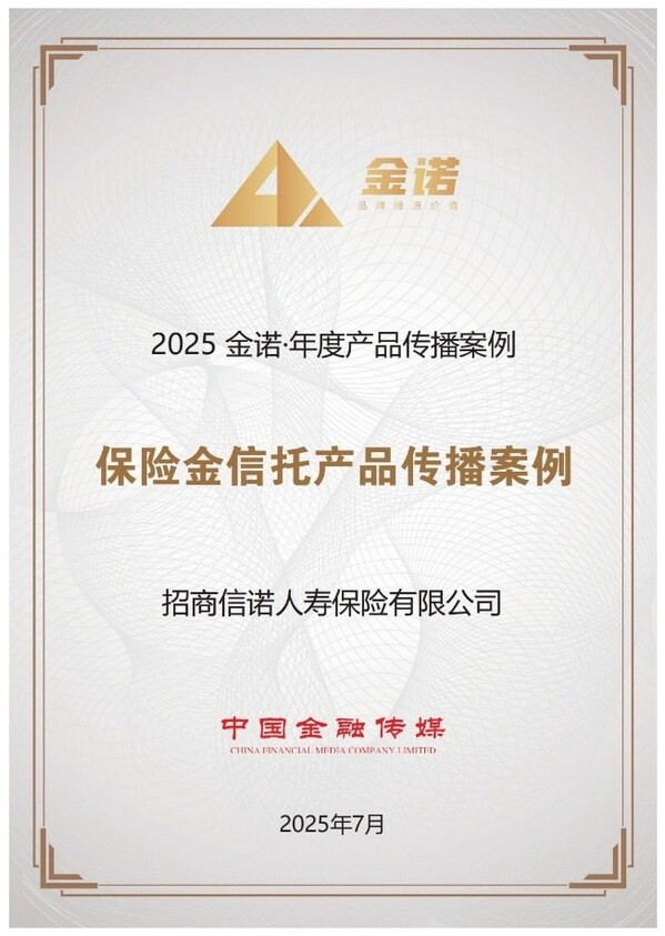 深圳2025年7月11日--7月8日,中国金融传媒正式揭晓2025年度"金诺•金融品牌影响力案例"榜单。招商信诺人寿保险有限公司(以下简称"招商信诺")凭借其在保险金信托服务领域的卓越创新力与标杆性传播实践,成功斩获"2025金诺•年度产品传播案例"重磅奖项。此殊荣标志着继荣获国际权威媒体《亚洲银行家》"中国最佳养老财富规划"大奖之后,招商信诺保险金信托服务再度获得国内权威金融品牌奖项的高度认可。
